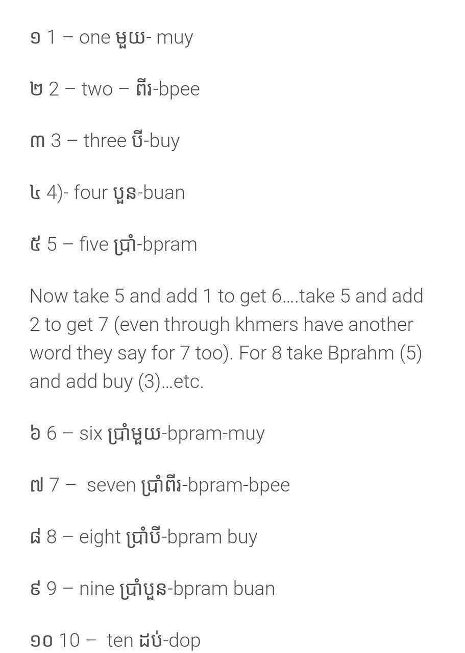 …國中語言自成音聲,雖近而占城暹人皆不通話說。如以一為梅,二為別,三為卑,四為般,五為孛監,六為孛監梅,七為孛監別,八為孛監卑,九為孛監般,十為荅呼。…
